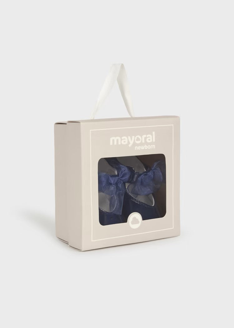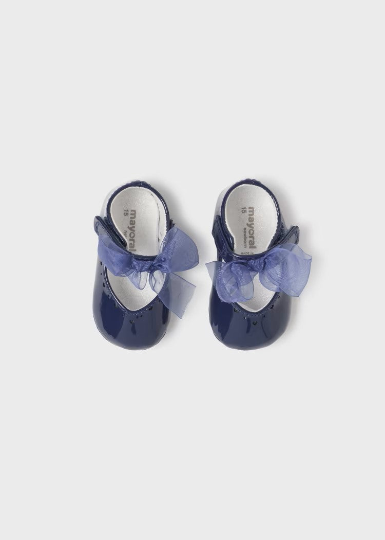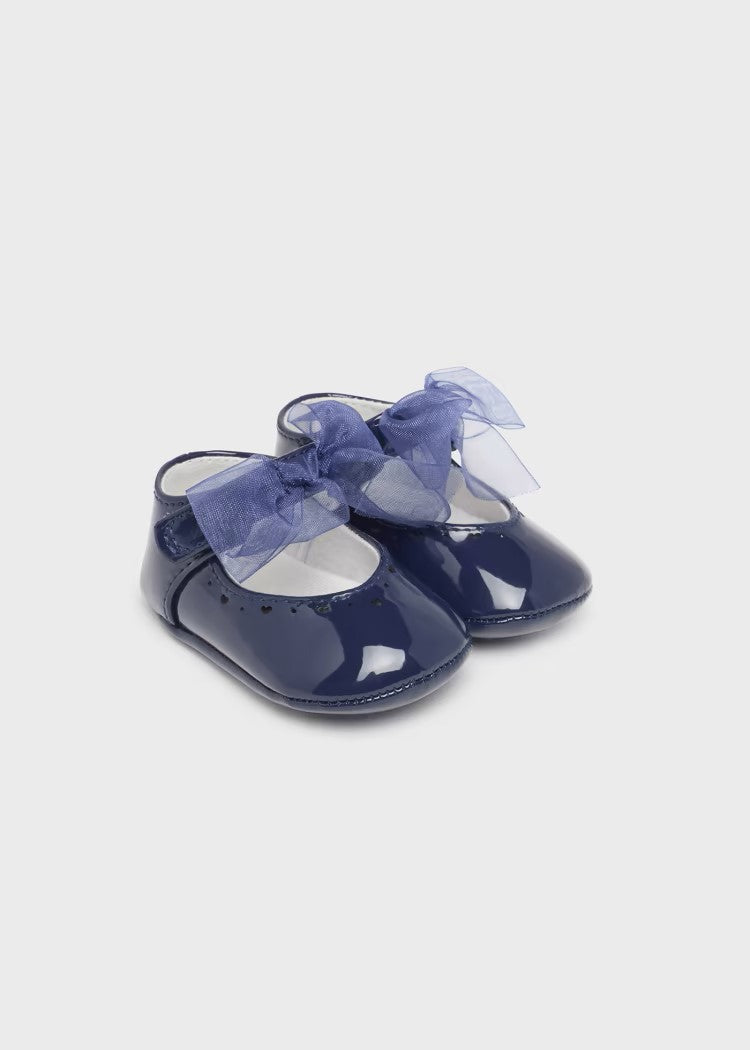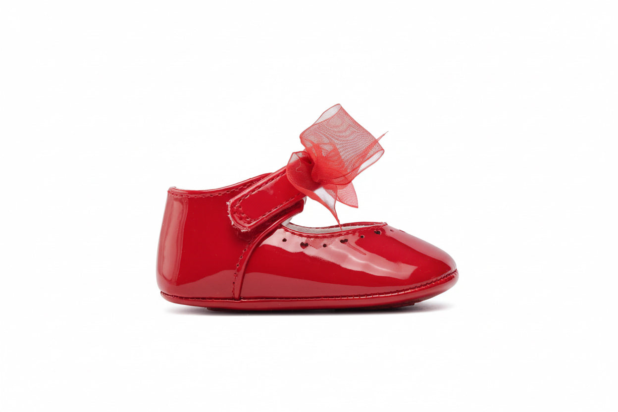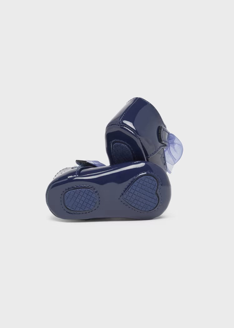 Sapato tipo bailarina para recém nascido, estilo clássico e intemporal para os estilos mais elegantes. Material exterior efeito pele. Sola leve e maleável. Laço decorativo.