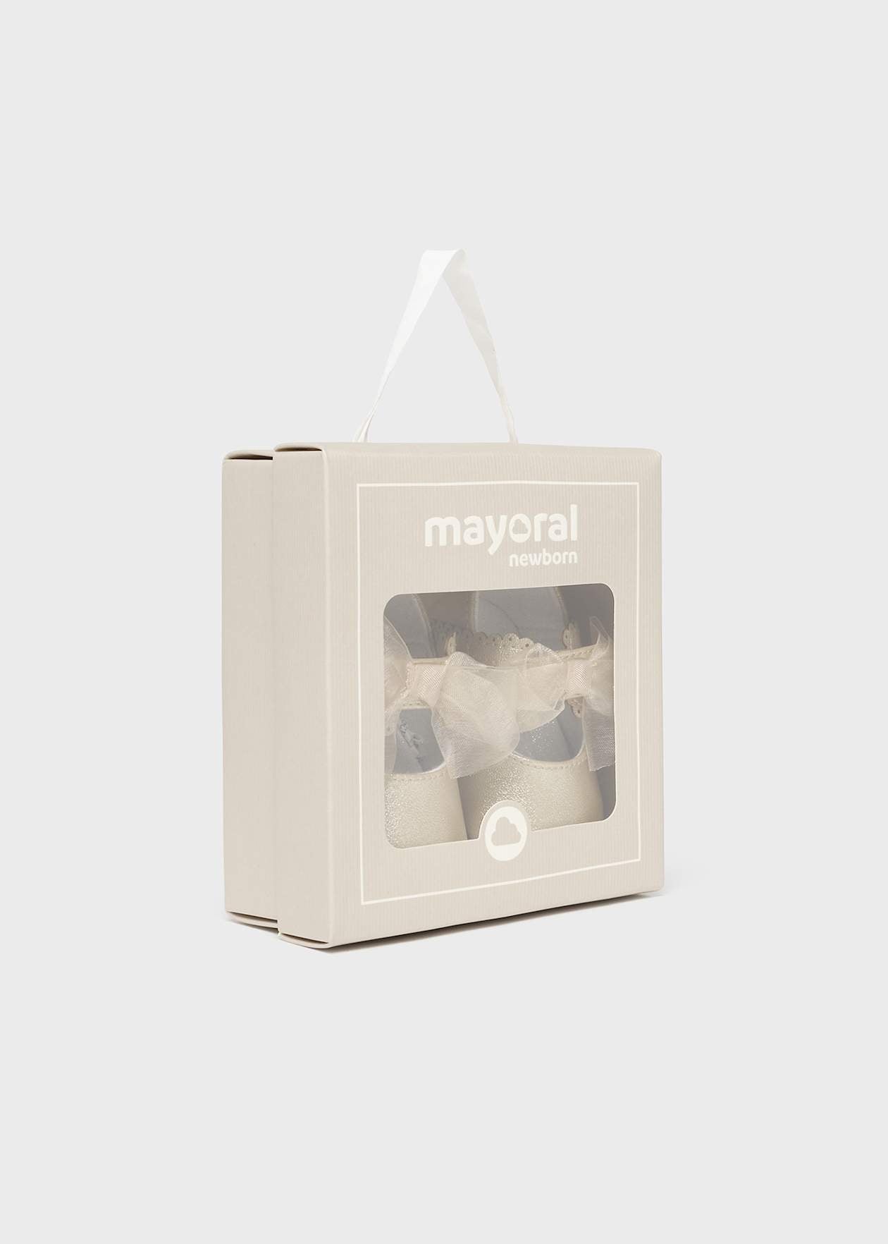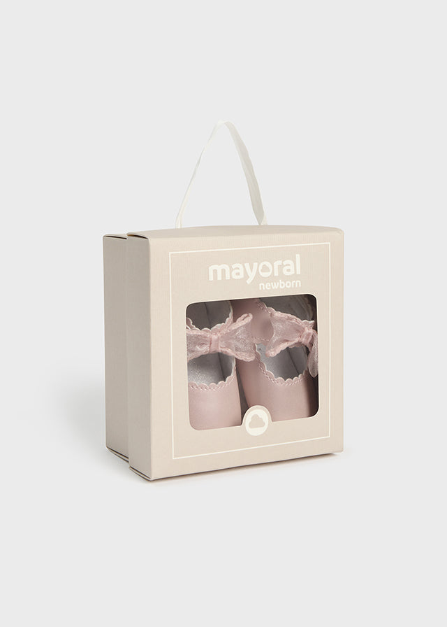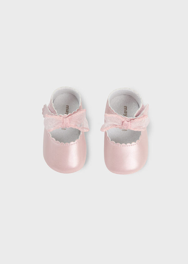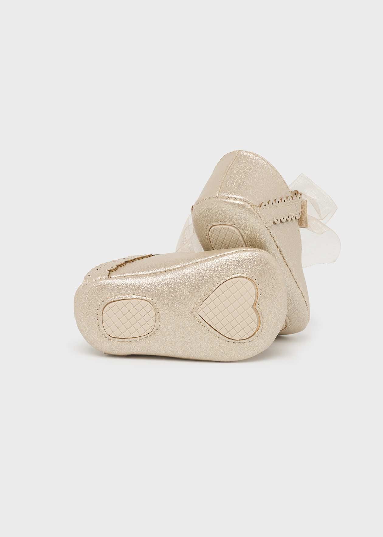 Sapato tipo bailarina para recém nascido, estilo clássico e intemporal para os estilos mais elegantes. Material exterior efeito pele. Sola leve e maleável. Laço decorativo.