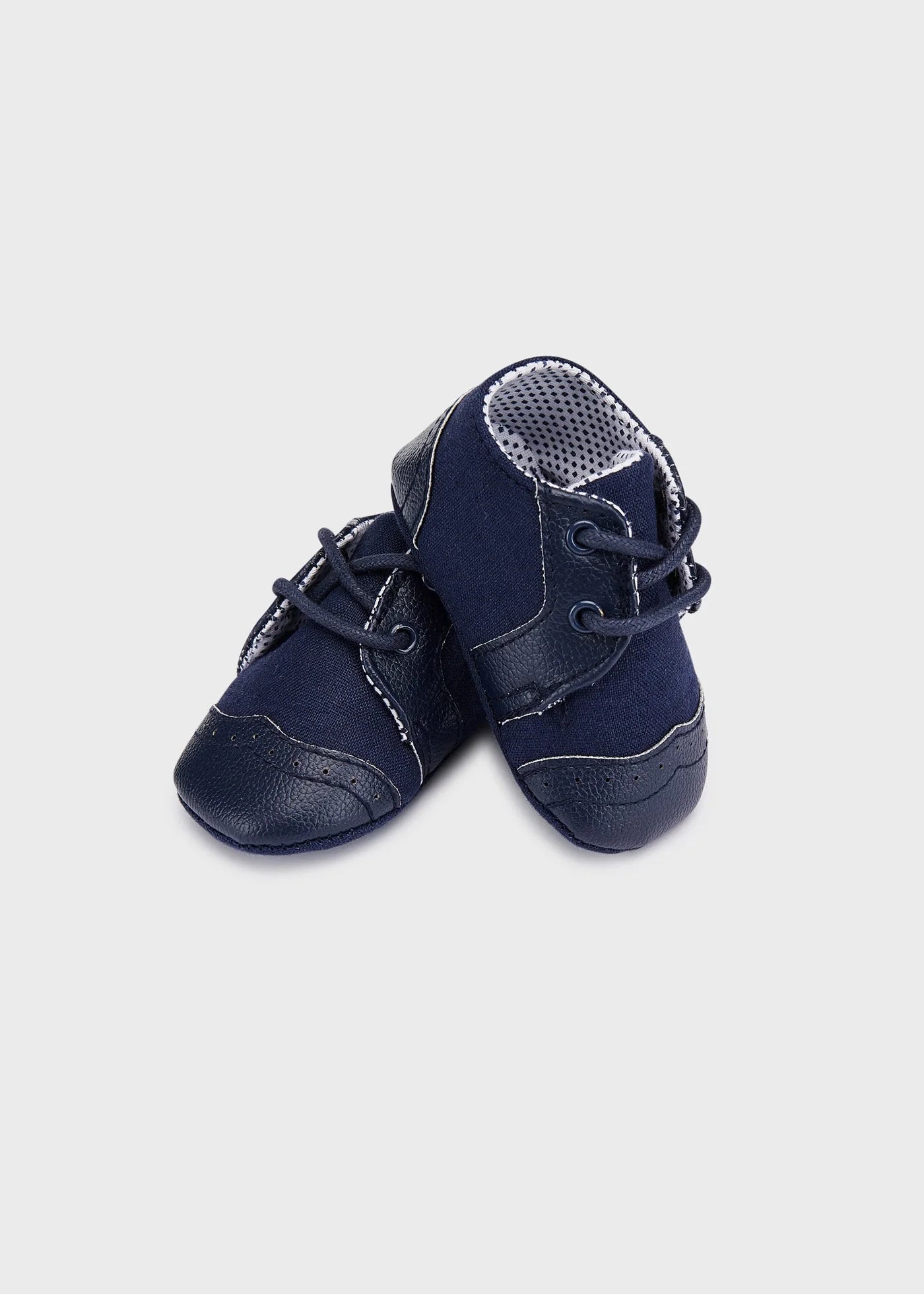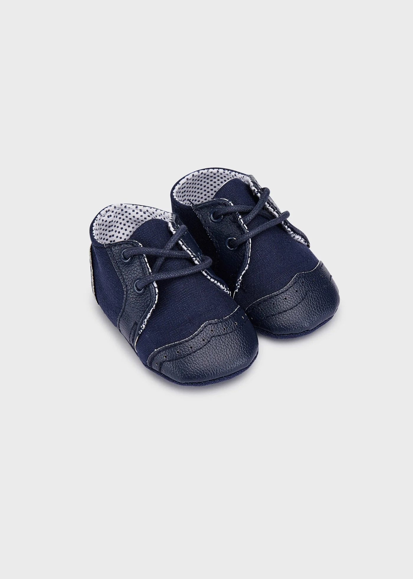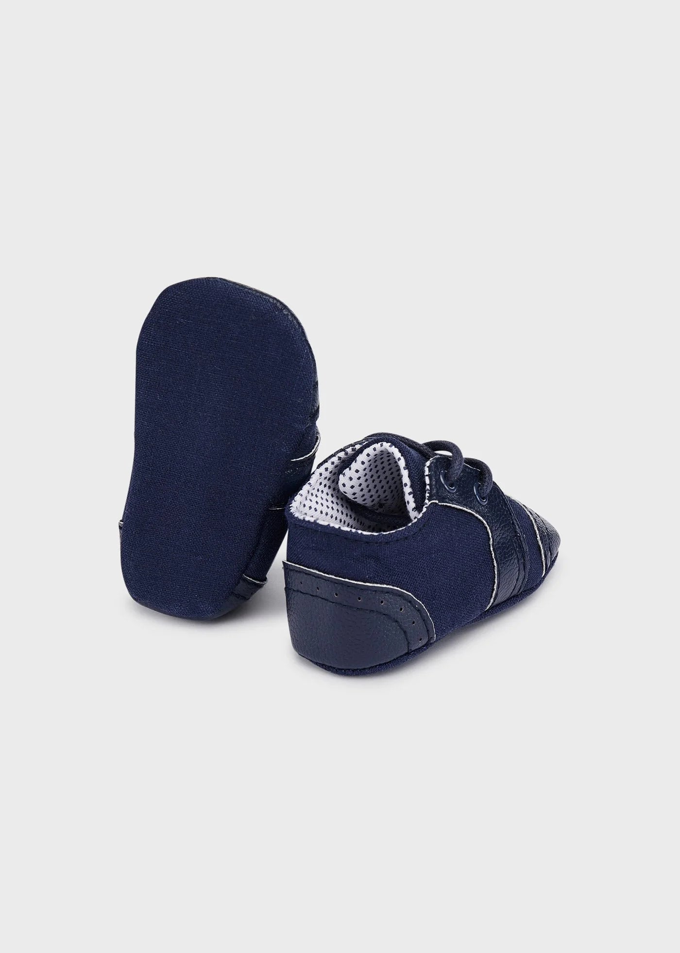 Sapatos pré-andador azuis marinhos doces para meninos, da Mayoral Newborn. Feitos de linho macio com acabamentos em couro sintético, eles têm detalhes costurados tradicionais na frente e um forro de algodão para um ajuste confortável.