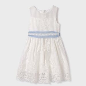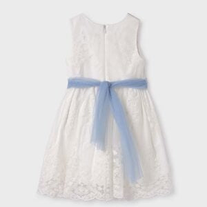 Vestido de cerimónia branco com tule contrastante, abertura invisível com fecho zíper traseiro e cinto de tule em tons azuis e bordados em branco.