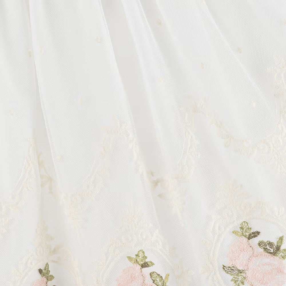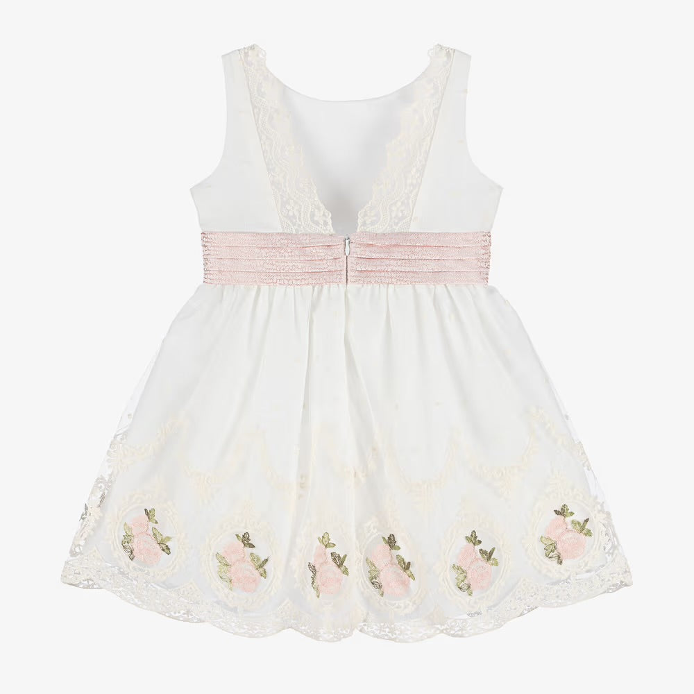 O vestido de tule bordado marfim e rosa para meninas da Miranda é perfeito para ocasiões especiais. Feito de tule macio e leve, o corpete apresenta delicados bordados de bolinhas e detalhes de tule. O cós jacquard rosa é adornado com um charme de logotipo perolado, e a saia é bordada com rosas cor de rosa, terminando com uma bainha recortada. Totalmente forrado em voile com uma camada de folhos para volume extra, este vestido fecha com um zíper oculto nas costas.