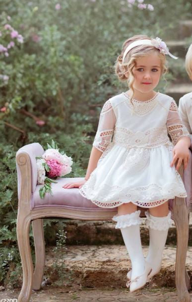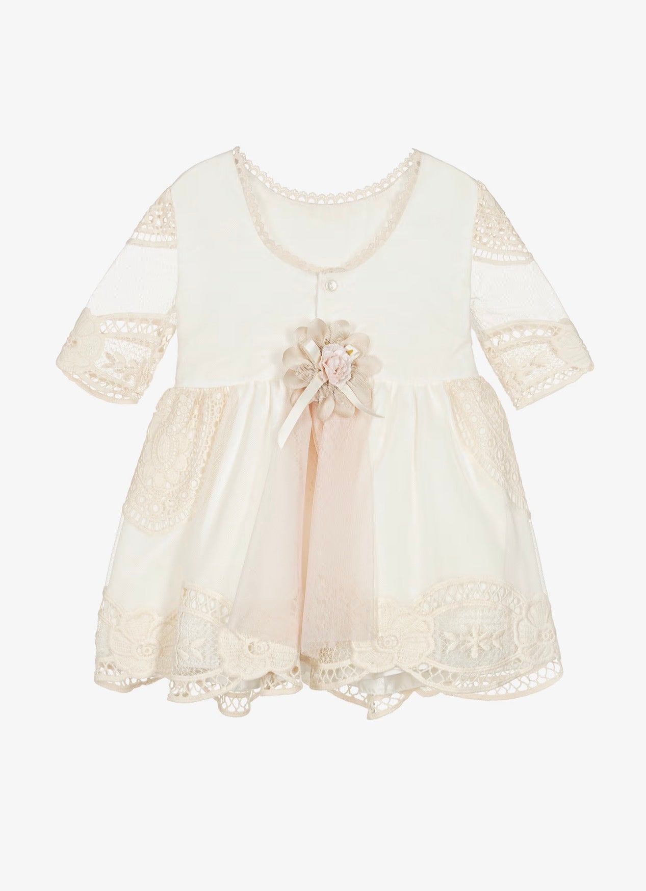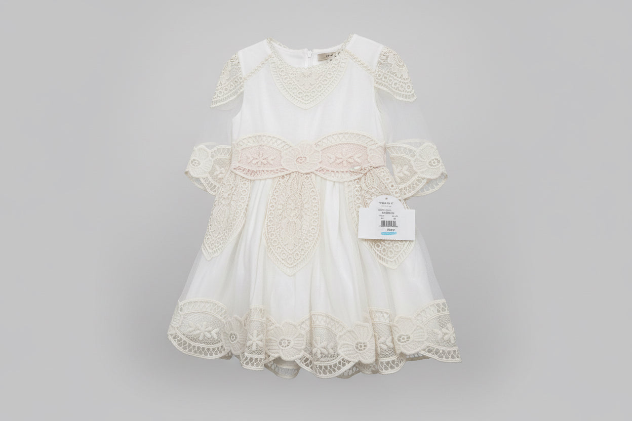 Vestido de cerimónia com detalhes de renda e fita em rosa bebé