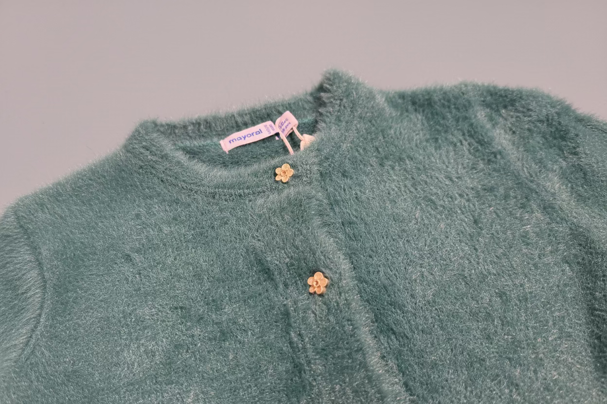 100%poliamida com efeito pêlo e pormenores dos botões em dourado no formato de flores.