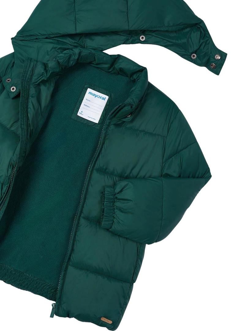 Casaco Mayoral. Modelo colegial. Cor verde. Tecido acolchoado. Fecho com zíper. Gola alta. Capuz removível. Bolsos laterais. Estilo básico.