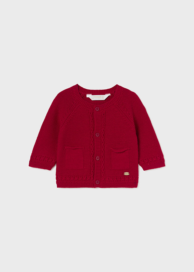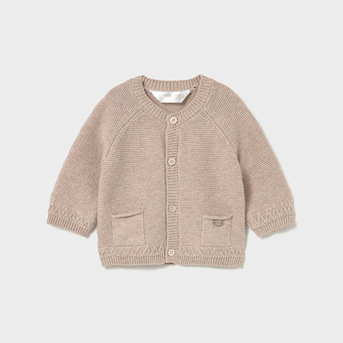 Contém poliamida reciclada. Casaco tipo cardigã de manga comprida para recém nascido. Gola redonda. Aperta com botões na parte da frente. Tecido de ponto tricô de tato suave e agradável. Bolsos funcionais na frente.