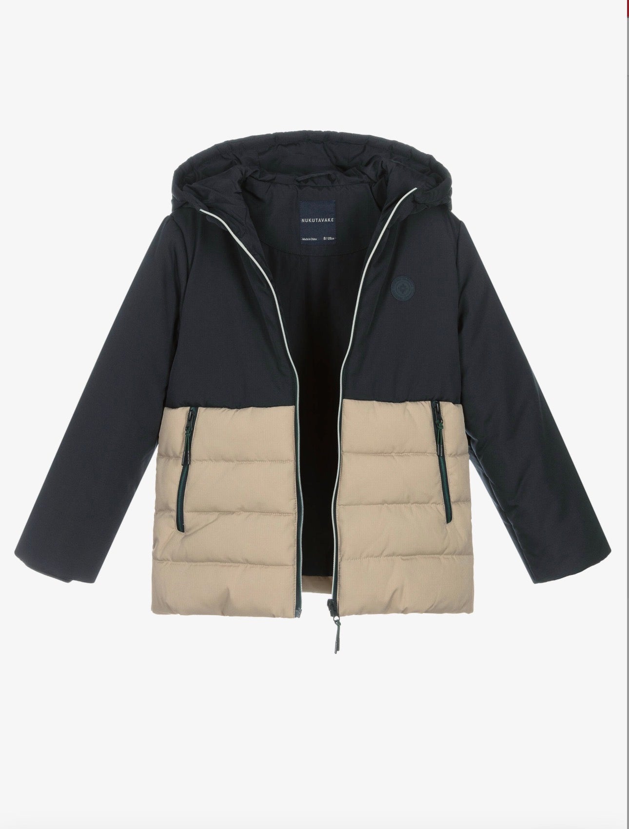 Casaco com capuz azul-marinho e bege, repelente à água, para meninos mais velhos, da Mayoral Nukutavake. Feita em tecido ripstop resistente e acolchoada para maior aquecimento, esté casaco com fecho de zíper possui um emblema com tema de inverno no peito. Os punhos canelados oferecem proteção extra contra o frio e há bolsos práticos com fecho de zíper