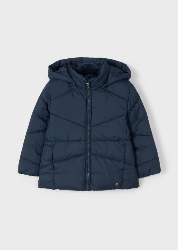 Blusão acolchoado para inverno e dias de chuva. Contém capuz removível com fecho. Bolsos laterais sem fechar. Modelo colegial Mayoral